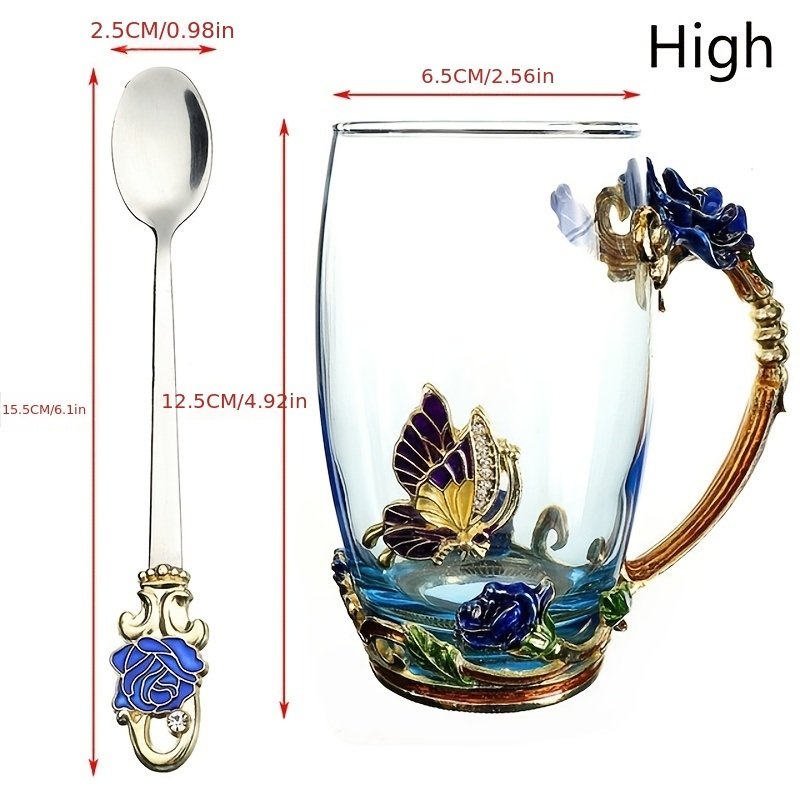 1pc Rose Enamel Crystal Tea Cup; Coffee Mug; Tumbler Butterfly Rose Painted Flower Water Cups; Clear Glass With Spoon Set