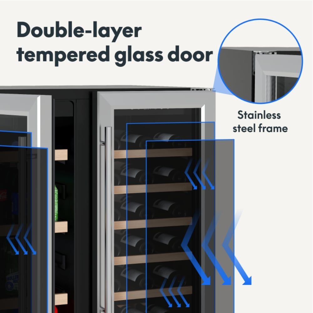 Independent Dual-Zone Cooling:Equipped with two independent cooling zones tailored to different temperature needs.Left Zone: 2-10℃ (35-50℉) – ideal for beverages.Right Zone: 5-18℃ (41-64℉) – perfect for wines.Enjoy a wide range of beverages at their optimal serving temperatures.