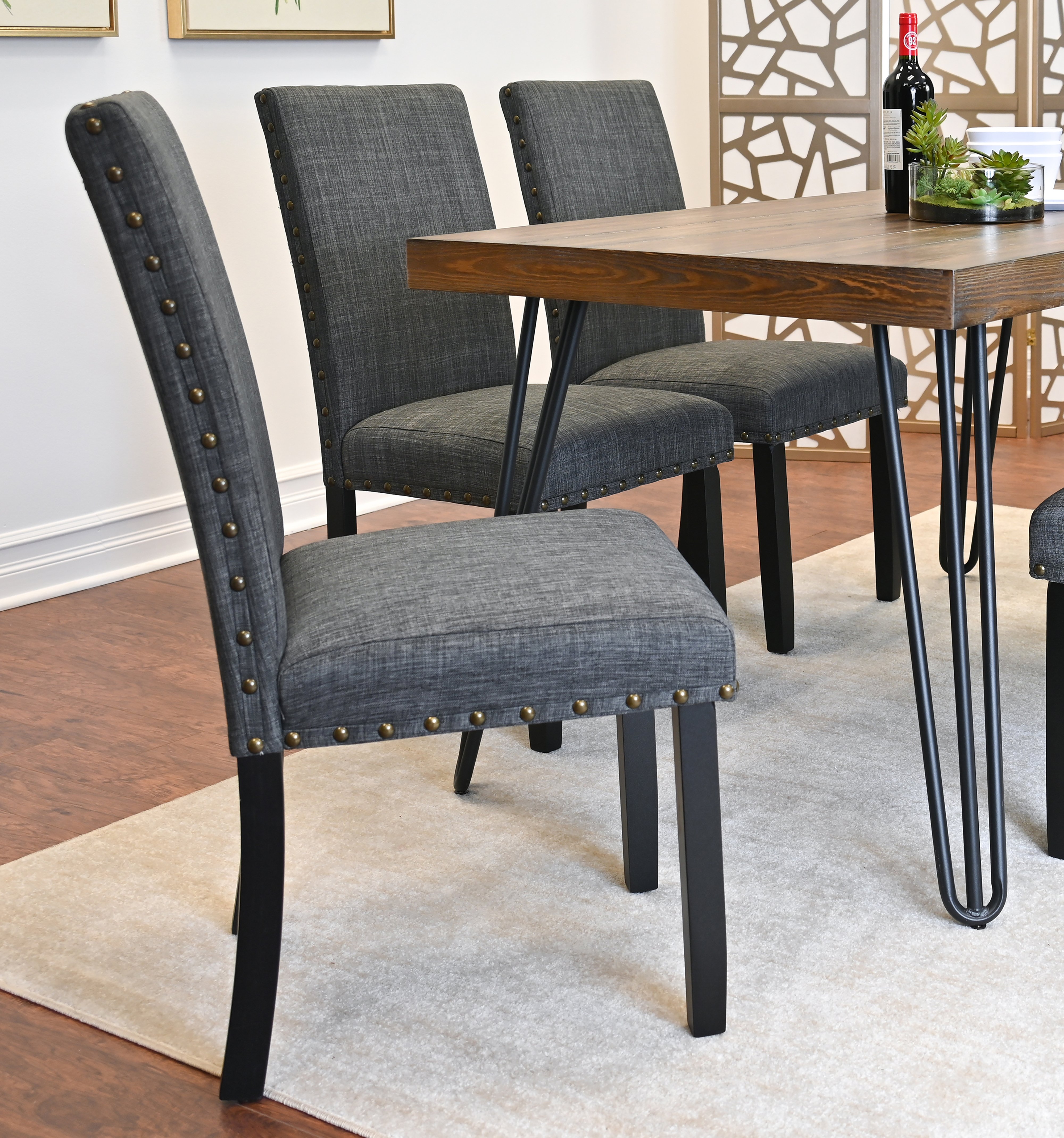 HIGHLIGHTS: The dining table features a metallic hairpin design, which adds both stability and style. It has a rustic dark pine finish and showcases a natural wood grain texture, offering an elegant look. The chairs feature fabric upholstery with brass nailheads, adding texture and visual appeal.