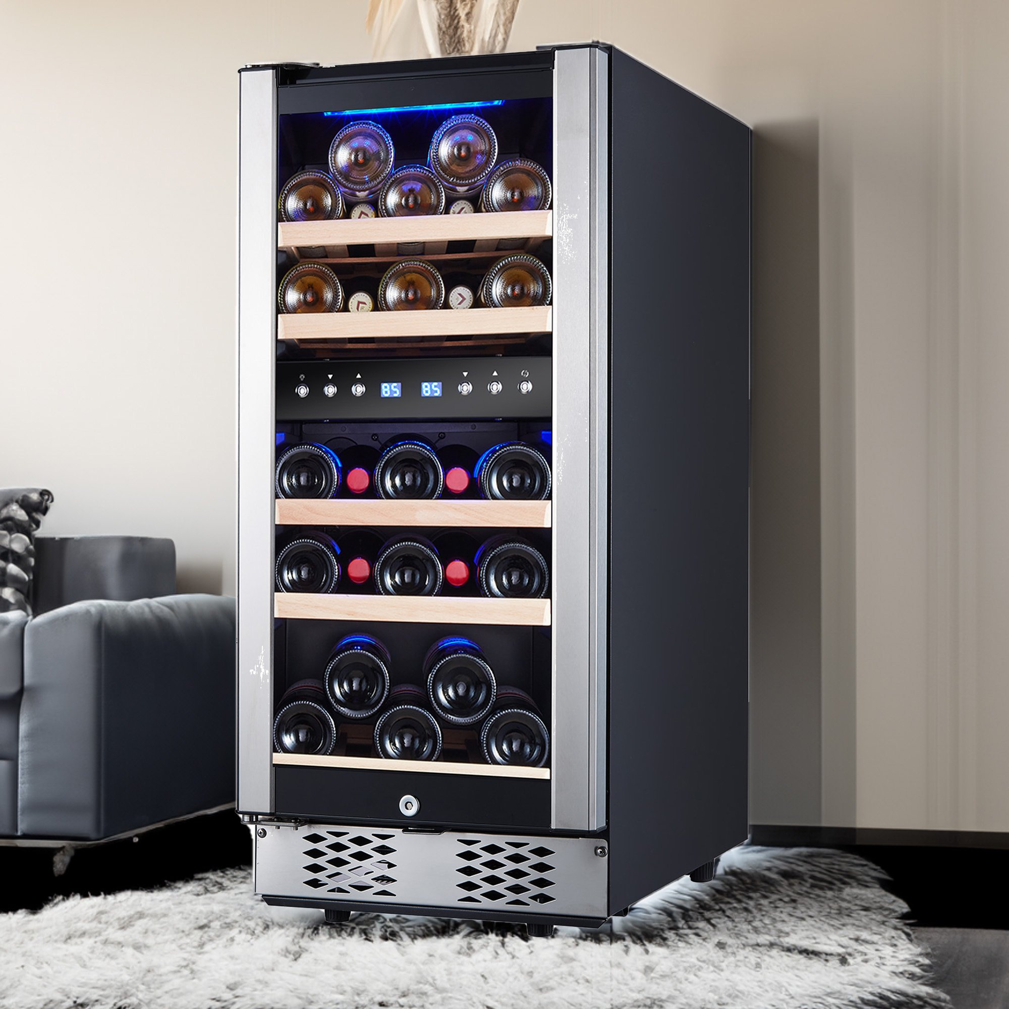 Overall, our 30-Bottle Dual Zone Wine Cooler Refrigerator is a perfect addition to any home, mini bar, or office. With its exquisite design, energy-saving technology, and customized temperature zones, your wine and other drinks will be perfectly chilled every time.