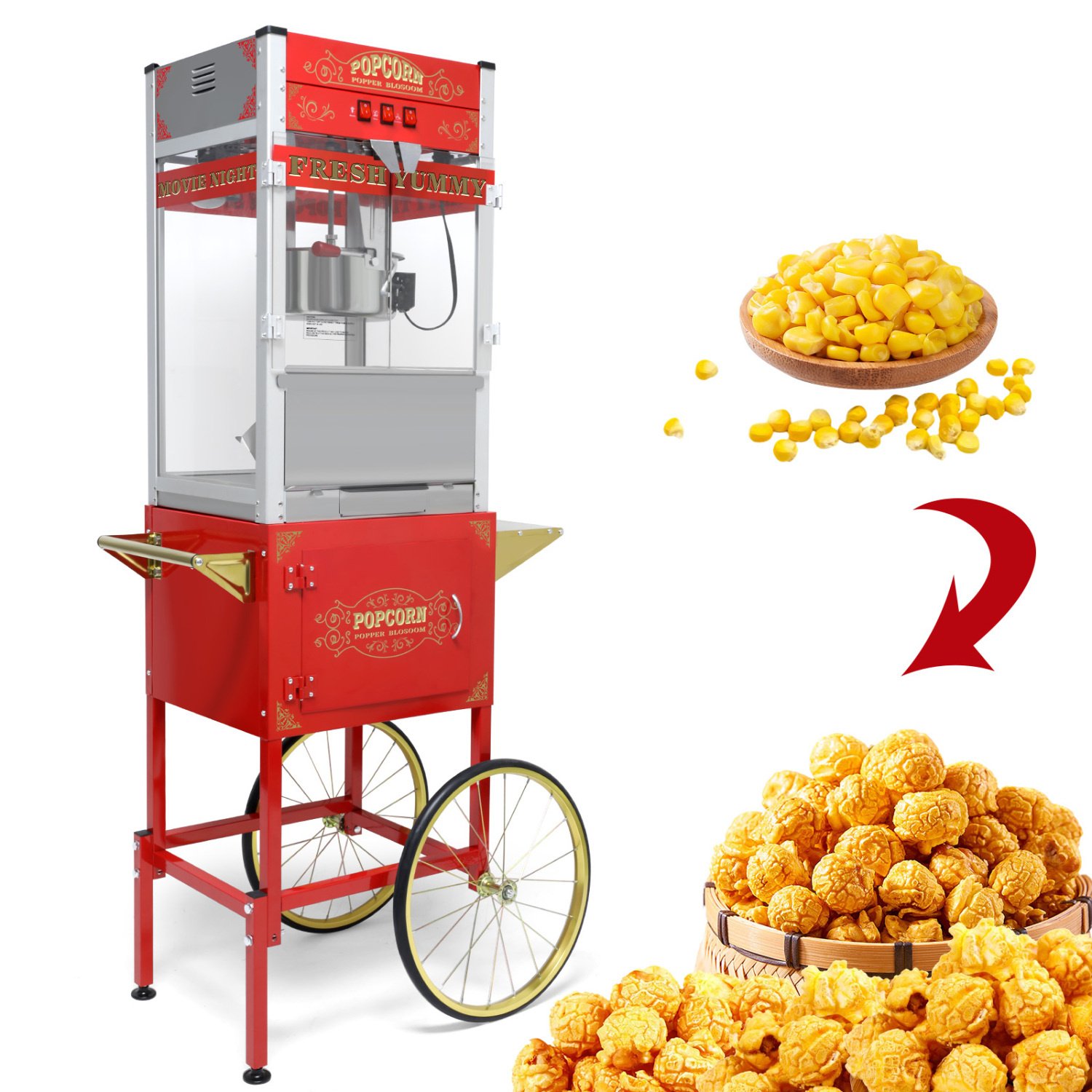 Popcorn Machine with Cart: This popcorn machine on wheels combines an antique-style design with modern features. The cart includes 16" bicycle-style wheels and a cabinet with storage space for popcorn supplies.making it perfect for home theaters, businesses, school events, parties, and more.