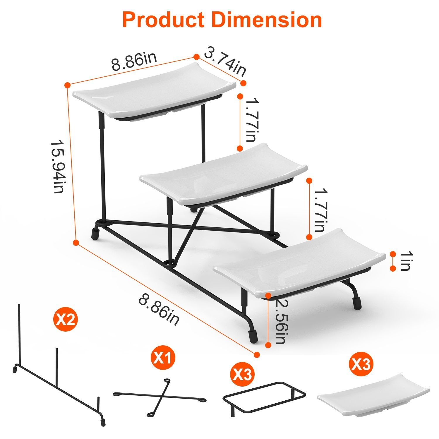 *Show Off Your Delicious Creation*:This food service rack with elegant white outlook,3-tier design and flexible angle-adjustable function after removing the X-shaped support bracket,can gracefully present meats and cheeses,breads,veggies at different heights and angle and fits nicely as a fruit stand,cupcake tray or cupcake stand,ensuring that your guests easily access to their selection of treat.