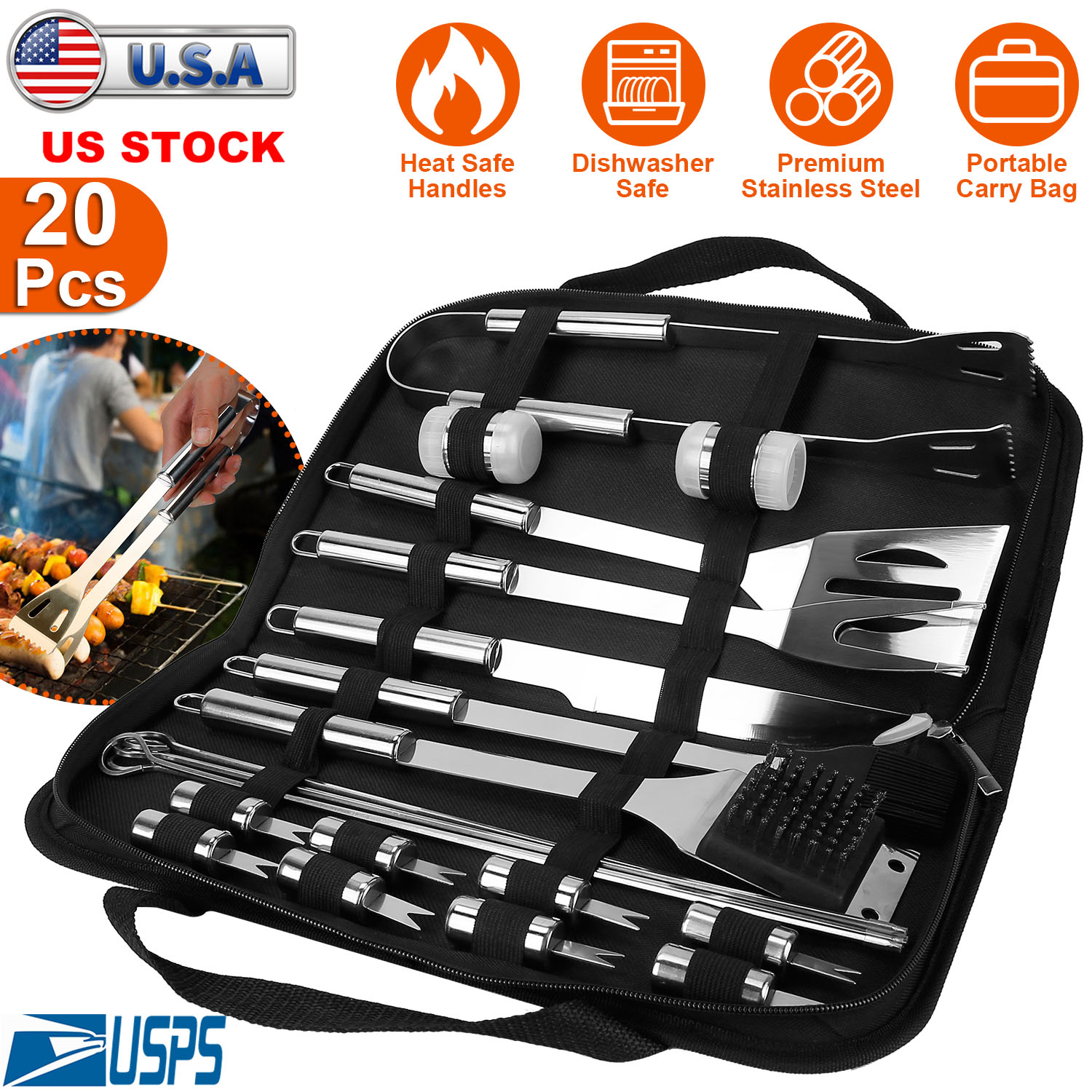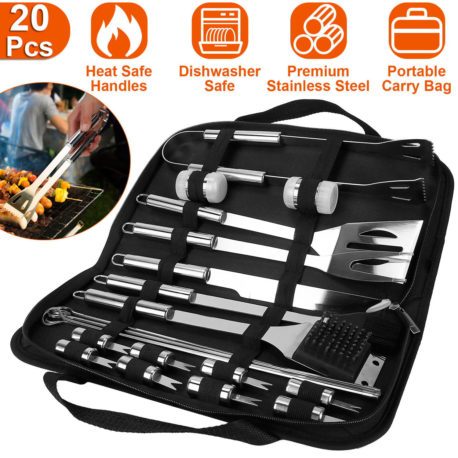 Each BBQ tool has been specifically designed for ease of use and comfort. Ergonomic grips and exquisite balance will make them feel like an extension of your arm. With these 20pcs BBQ tools, you can flip, skewer, and drag food like a real barbecue master. Made of premium stainless steel materials, they are won’t rust and crack, easy to clean and dishwasher-safe. BBQ tools set in a portable bag allow more convenient outdoor cooking. It is a perfect gift for you and BBQ lovers, an ideal choice for Fathers\' Day, Christmas, Birthdays and more.