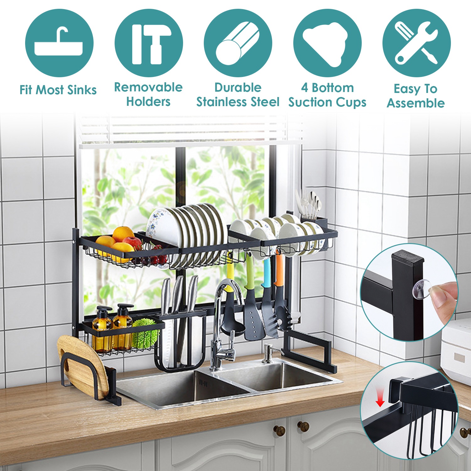 It’s time to say goodbye to wet countertops and stained utensils. If you’ve washed your utensils without the help of a dishwasher, then you will know how handy a dish rack can be. Our practical over sink dish drying rack aims to make all the counter stuffs tidy and dry easily and greatly save limited space on the countertop. It can hold a large amount of items up to 88lbs, which allows you to store all the dishware such as bowls, plates, pans, spatulas, vegetables and fruits, detergent, rags, and etc.. A definitely necessary kitchen organizer to keep you away from past chaos!