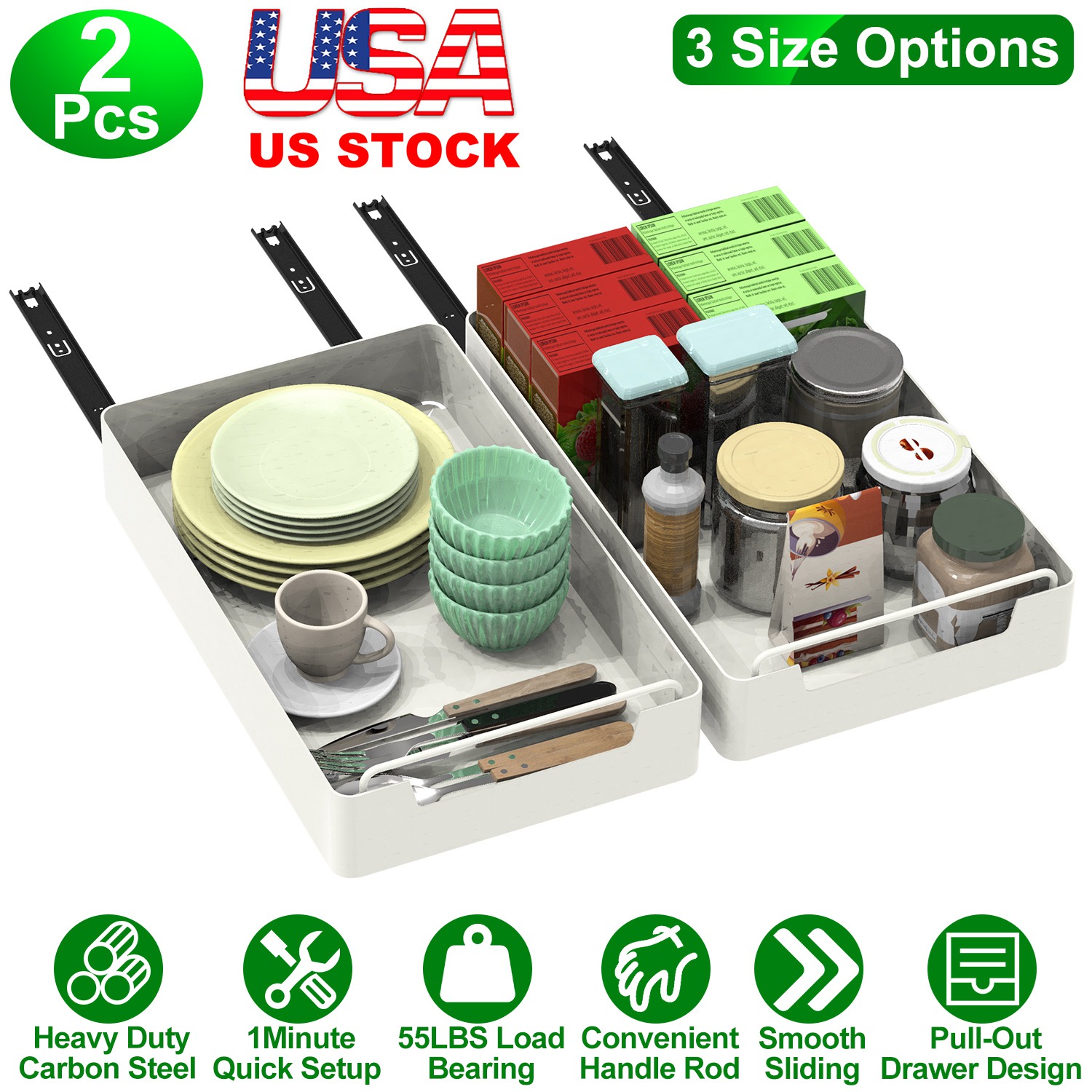 2Pcs Pull Out Cabinet Organizers Sliding Shelf Spice Rack Carbon Steel Roll Out Drawers Fixed with Adhesive Nano Film with Handle 55LBS Max Load