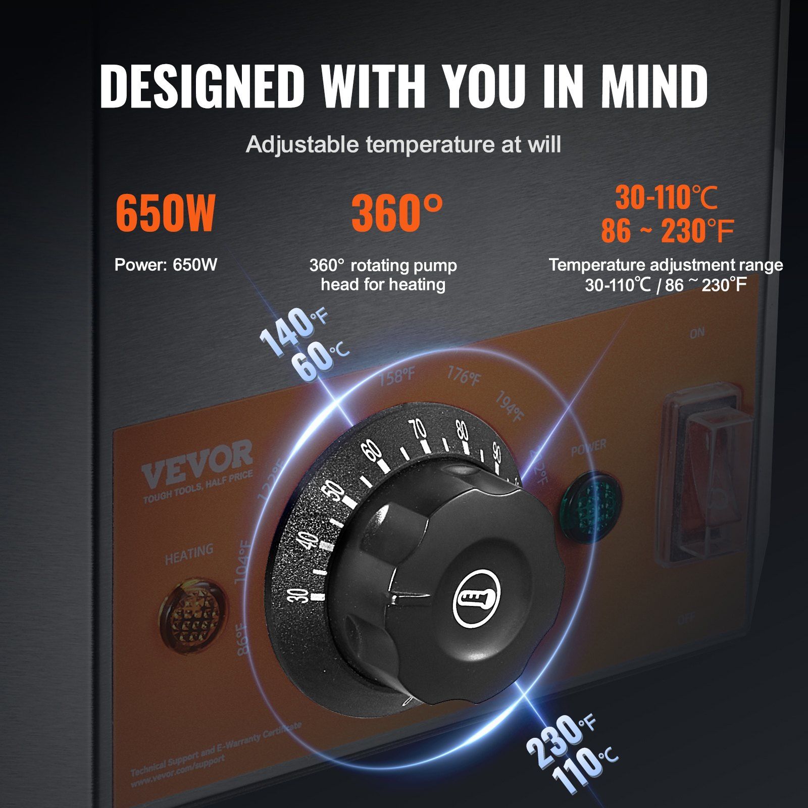 2.Precision Temperature Control: The hot fudge warmer offers a wide range of temperature settings from 86 ~ 230°F (30-110°C). Its powerful 650W ensures the water in the tank heats up swiftly to your chosen temperature. Should the water temperature dip, it will automatically reheat to maintain the set temperature, ensuring your sauce remains warm and ready to serve.
